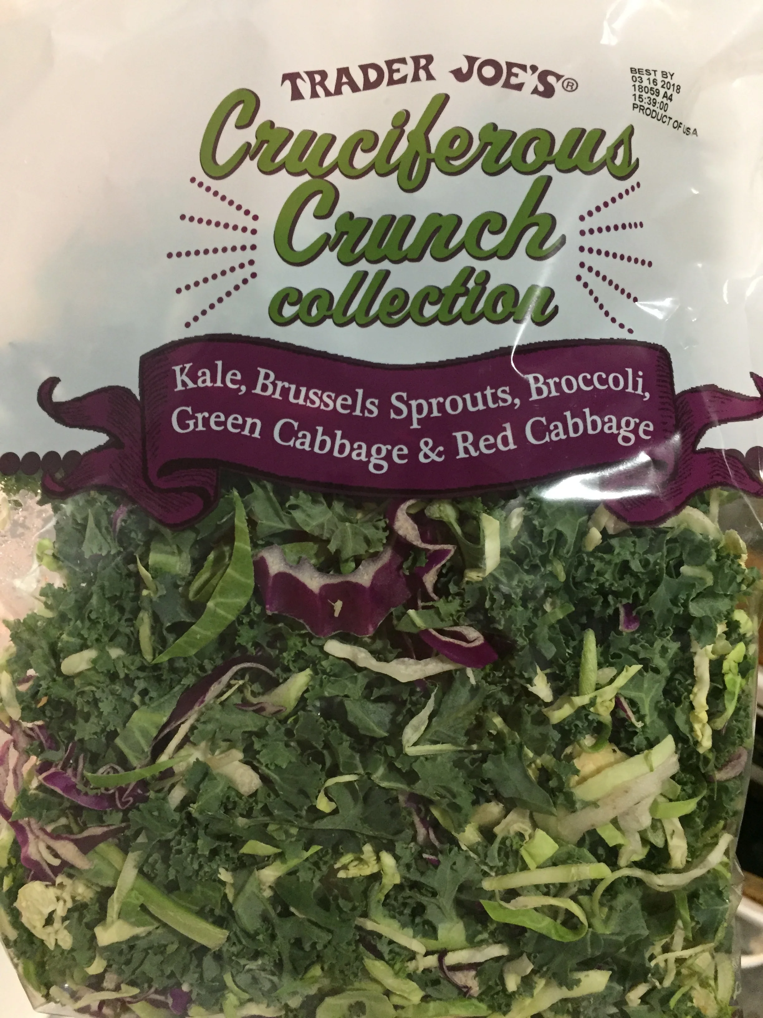 Cruciferous Crunch--Nutrition in a bag, right here. A blend of shredded cruciferous veggies (kale, cabbage, Brussels sprouts, broccoli). You can use it as a salad, but I most often just dump a bag in a skillet with a bit of avocado oil, salt, and pepper, and let it wilt. Sometimes with a drizzle of balsamic vinegar at the end. It's the perfect easy side dish for any meat or fish, but I really love it with scrambled eggs. Sometimes I even just scramble the eggs right in the pan with the cruciferous crunch after it's wilted a bit. For lunch for one, my ratio is 1/2 bag of cruciferous crunch, 3 eggs, plus a bit of cheese at the end.
