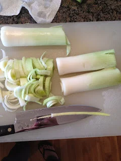A few words about leeks: I wouldn't suggest substituting anything for them. If you grocery store is out of leeks, postpone trying this soup. Leeks are one of those ingredients that cause the checker a bit of alarm as she quizzes me with a frantic "what are these??" when searching for the produce code. I think they are becoming more widely available, but my guess is that most people aren't comfortable approaching them. They are actually a wasteful little vegetable--you only use about the bottom third. To add to their charm is a bunch of sand/dirt hidden inside them that you don't want in your soup. So, cut the tops off down to the very lightest green part, cut off the root end, and slice the leek in half lengthwise. Slice into half moons at this point and then add to a bowl of cold water. Swish the leeks around in the water and the sand/grit will fall to the bottom. You can pull your clean leeks out of the top and give them a quick pat to try them off a touch before adding to your pot. I thought a couple of pictures might be helpful in this situation.