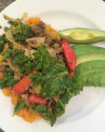 In a large skillet brown the ground beef. Remove to a plate and set aside. Add the oil to the skillet and then the bell peppers and onions and saute until they are tender. Return the beef to the pan. Add all of the spices and mix well. Add the kale and green olives, continue cooking stirring often until the kale is tender (about 4-5 minutes). While the beef is cooking, boil your sweet potatoes until tender. Drain and mash roughly with a potato masher, adding salt/pepper, and a splash of milk. Serve the beef mixture atop the mashed sweet potatoes with a side of sliced avocado--or just chop up the avocado and place it on top. Whatever floats your boat.